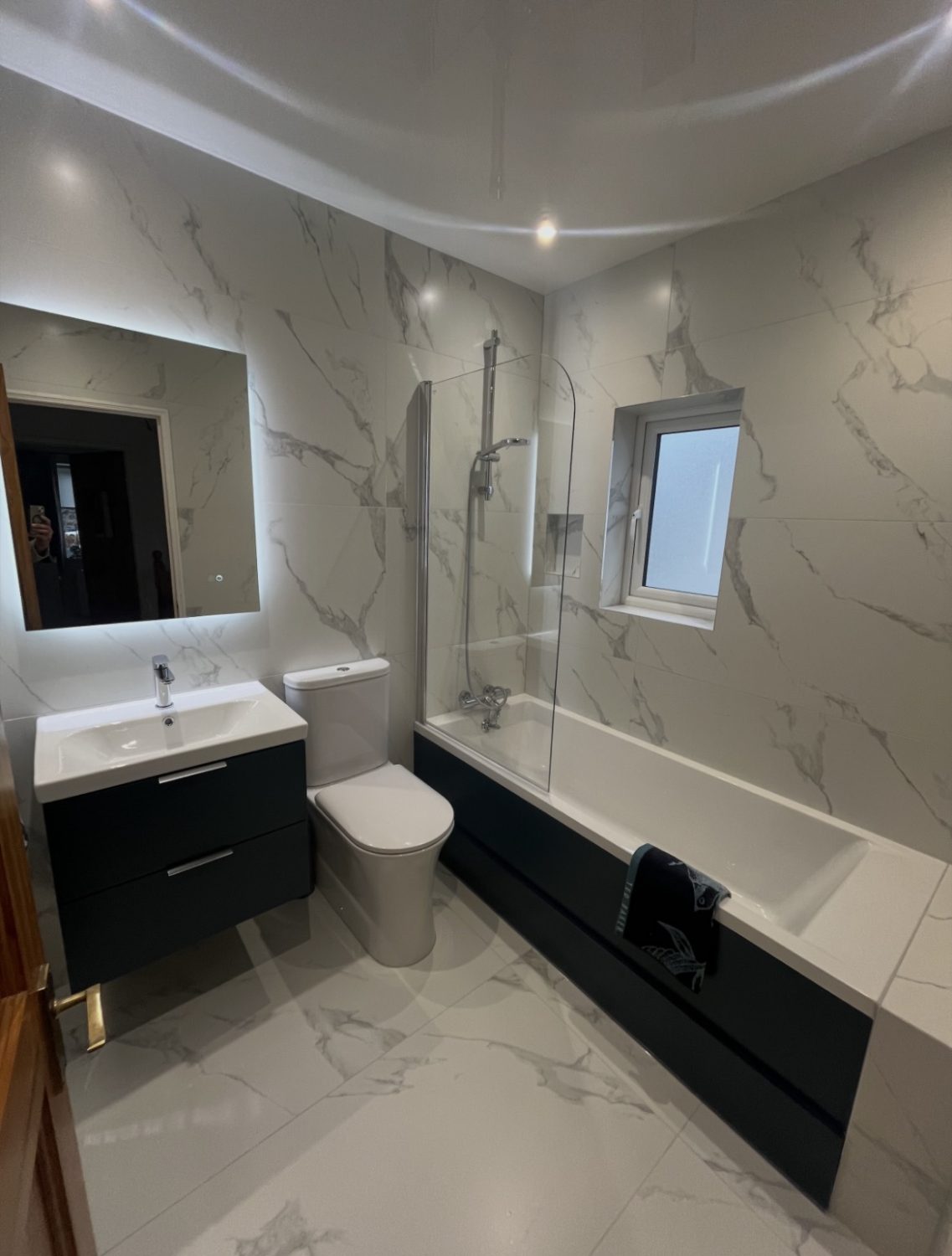 A modern bathroom with marble-effect tiles, a sleek vanity, LED mirror,and a combined bath-shower.