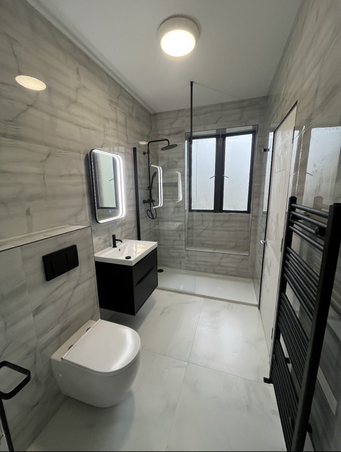 A bright modern bathroom with a walk-in shower, marble-effect tiles, black fixtures, and an LED mirror. Clean lines, smart layout, and a crisp contemporary finish.