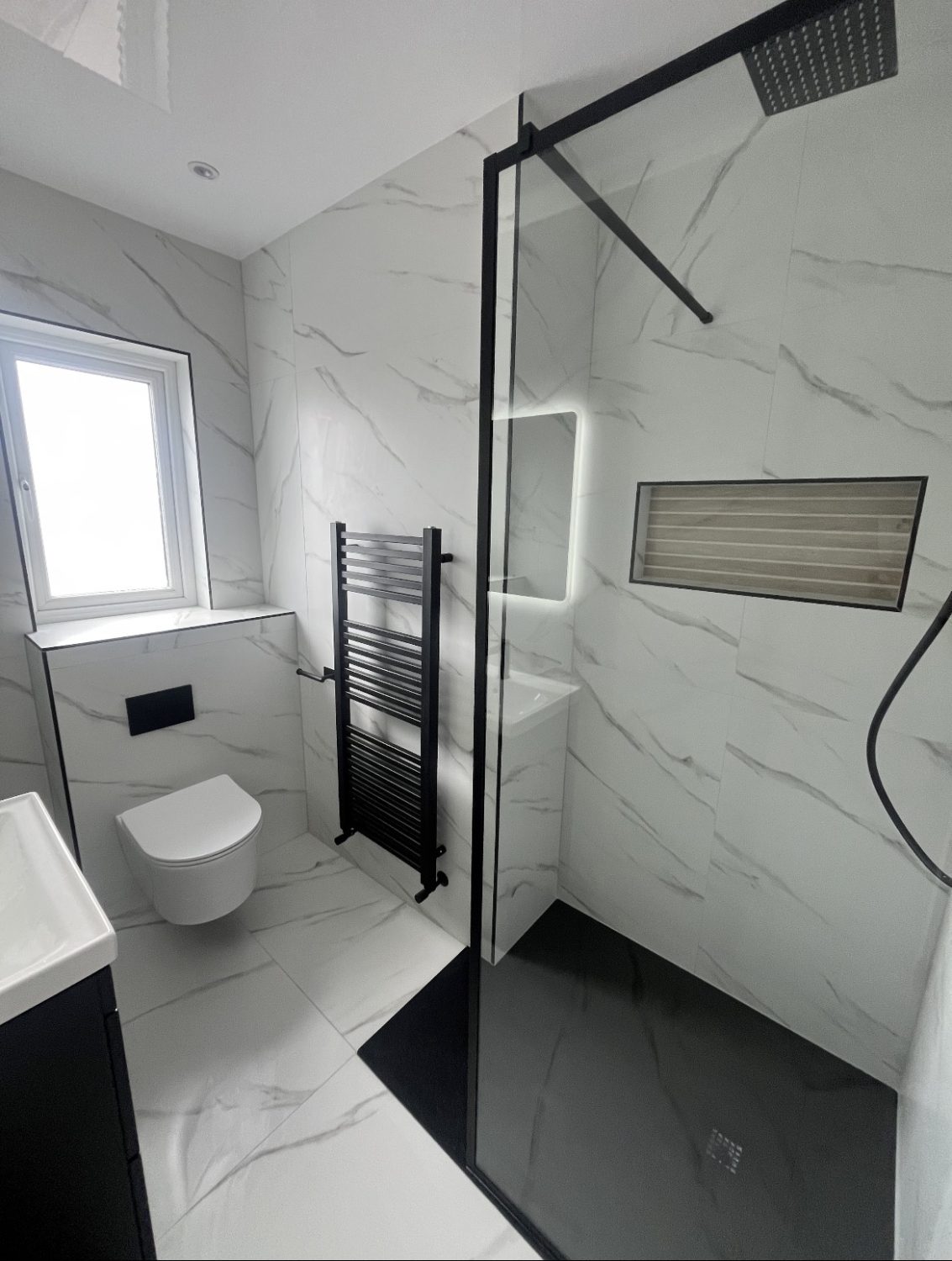 A sleek walk-in shower bathroom with marble-effect tiles, black fittings, and a clean, modern finish.