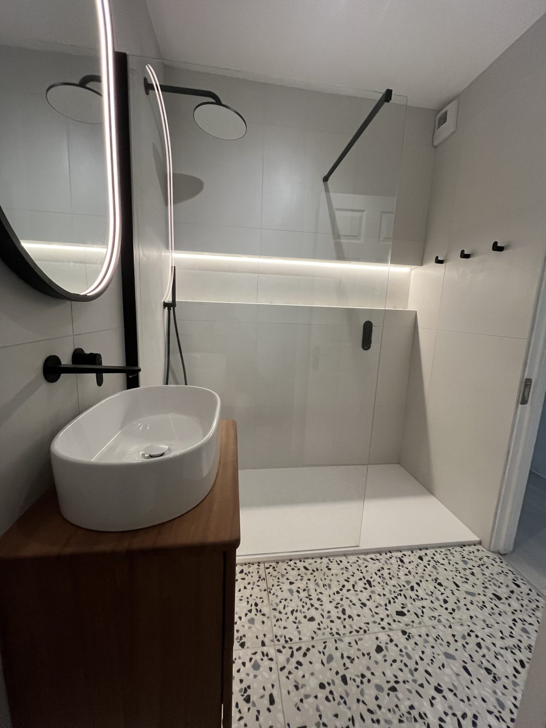 Terrazzo Dream is a refined,contemporary bathroom where clean architectural lines meet natural warmth. Soft neutral tiling and a glass shower create an airy, light-filled space, while matte black featured add sharp, modern contrast. The handmade bespoke solid teak vanity unit floats effortlessly against the wall, bringing richness, texture, and craftsmanship to the setting. Understated lighting and terrazzo floor complete the look, delivering a space that feels calm, elevated, and quietly luxurious.